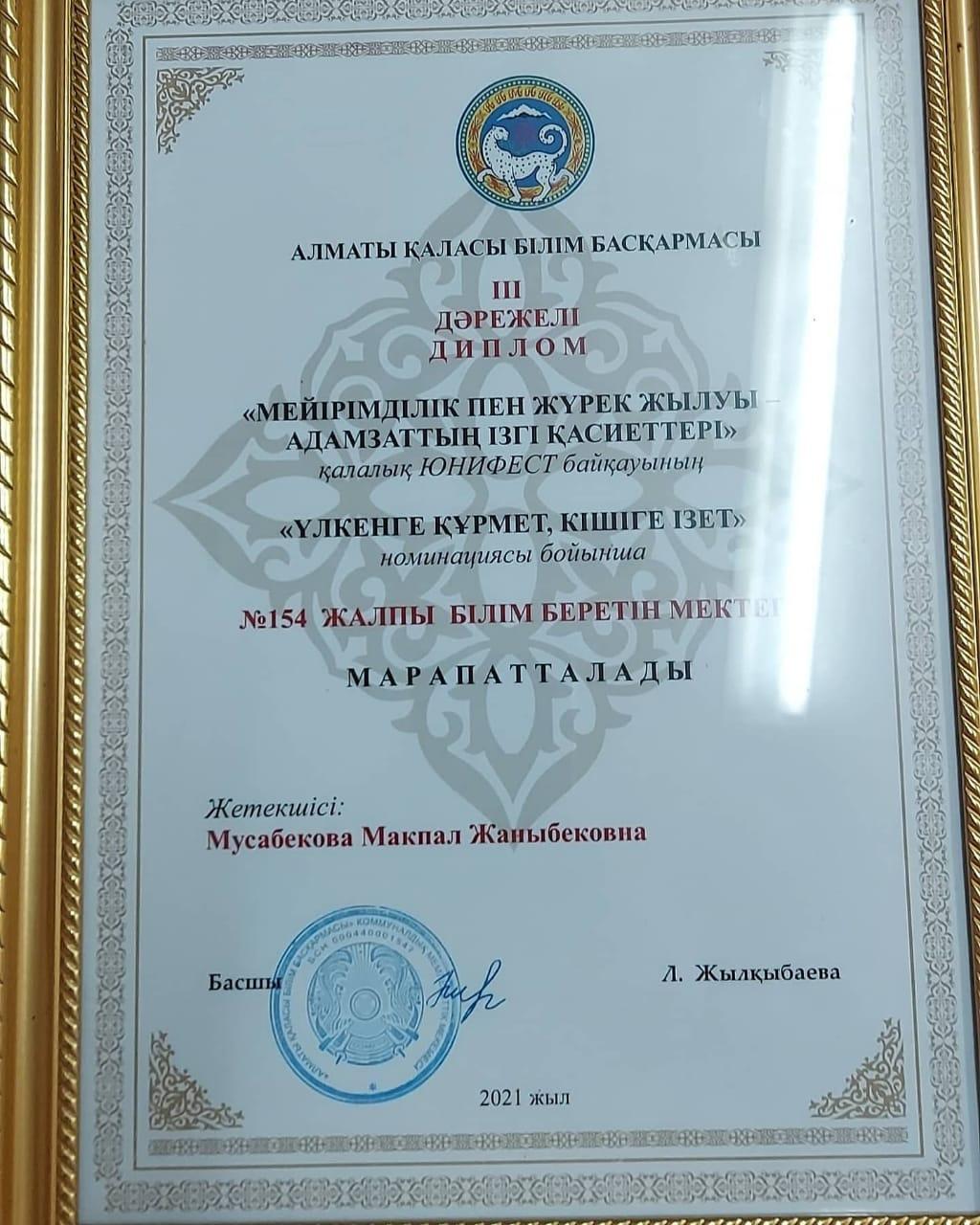 Алматы қаласы Білім басқармасы, қалалық білім берудегі жаңа технологиялар мен ғылыми-әдістемелік орталығының рухани-адамгершілік тәрбие және өзін-өзі тану бөлімінің ұйымдастыруымен "Мейірімділік пен жүрек жылуы-адамзаттың қасиеттері" атты қалалық ЮНИФЕСТ байқауына И.Қ.Мандоки атындағы 154 ЖББМ оқушылары және жетекшісі Мусабекова Макпал Жаныбековна қатысып, "Үлкенге құрмет, кішіге ізет" номинациясы бойынша Алматы қаласы Білім басқармасының басшысы Л.Жылқыбаеваның ІІІ дәрежелі ДИПЛОМЫМЕН марапатталды.