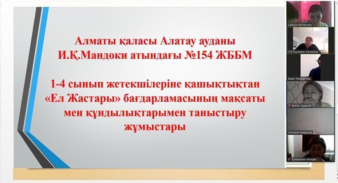2020 жылдың тамыз айының 28-і күні мектепішілік «Ел Жастары» бағдарламасына арналған жылдық жұмыс жоспары құрылып, жоспар бойынша, 18.09.2020ж. 1-4 сынып жетекшілеріне қашықтықтан «Ел Жастары» бағдарламасының мақсаты мен құндылықтарымен таныстыру жұмыстары өткізілді. Барлық қатысқан сынып жетекшілер саны – 40.