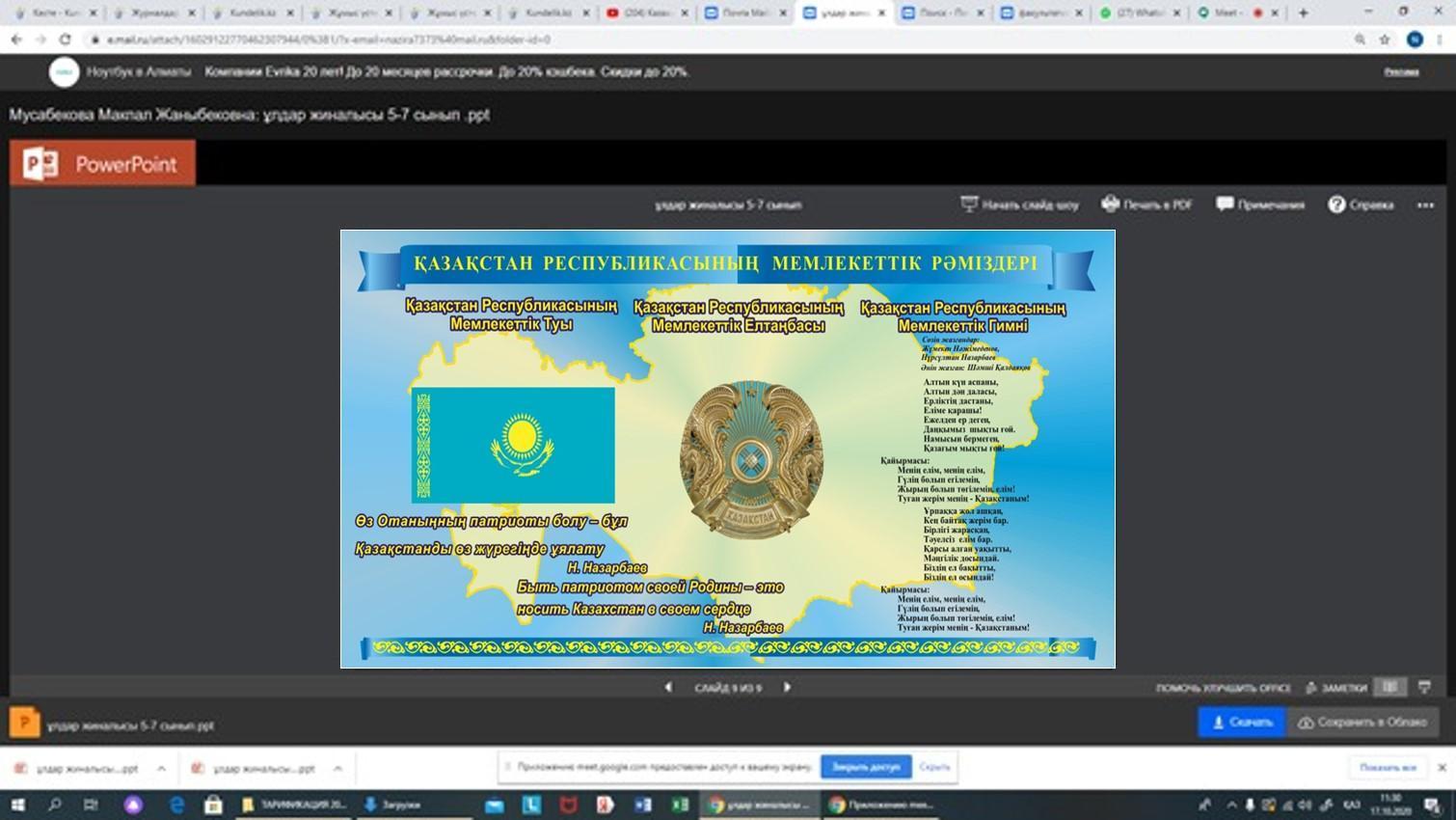 16.10.2020ж. күні 5 сынып оқушылары арасында «Еліміздің мемлекеттік Елтаңбасы. Қала гербі. Өз отбасының гербін қалай елестесің?» тақырыбында 5 «Г» сынып жетекшісі Ж.Д.Базарбаева онлайн жарыс өткізді. Оқушылар 5 топқа бөлініп, барлығы 35 оқушы қатысты.