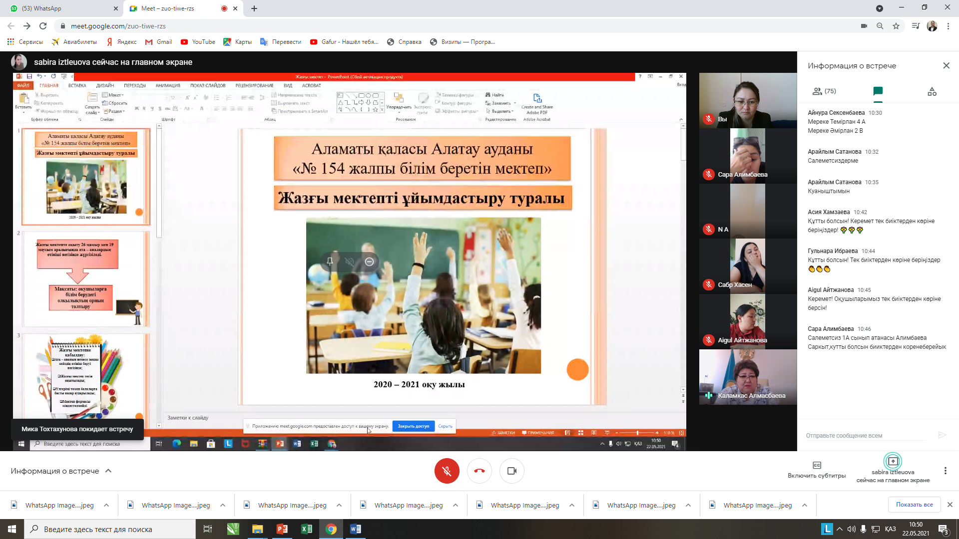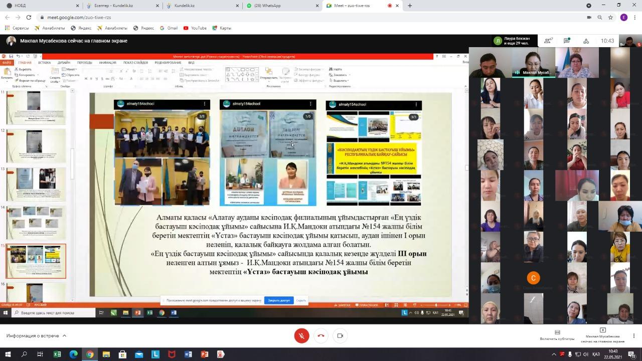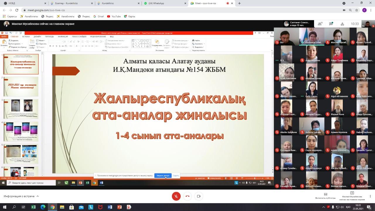 Қазақстан Республикасының Бэілім және ғылым министрлігі 2020-2021 оқу жылының аяқталуын ұйымдастыру мақсатында орта білім беру ұйымдарына арналған Жалпыреспубликалық ата-аналар жиналысын өткізу тұжырымдамасы бойынша 2021жылдың 22 мамыр күні Алатау ауданы И.Қ.Мандоки атындағы №154 жалпы білім беретін мектепте 1-4 сыныптардың ата-аналарымен онлайн жалпыреспубликалық ата-аналар жиналысы өткізілді. Жалпыреспубликалық ата-аналар жиналысының мақсаты: ата-аналарды (балалардың заңды өкілдерін) 2020-2021 оқу жылының қорытындылары туралы хабардар ету және ата-ананың педагогтермен жеке сөйлесуі арқылы баланың үлгеріміне егжей-тегжейлі талдау жасауға мүмкіндік беру. Жалпыреспубликалық ата-аналар жиналысына Алматы қаласы қаласы ғылыми әдістемелік орталығының маманы Сулейменова А.К. қатысты. Барлығы 225 ата-ана қамтылды.
