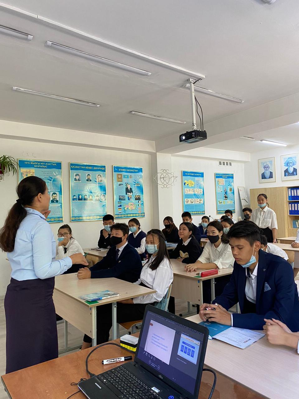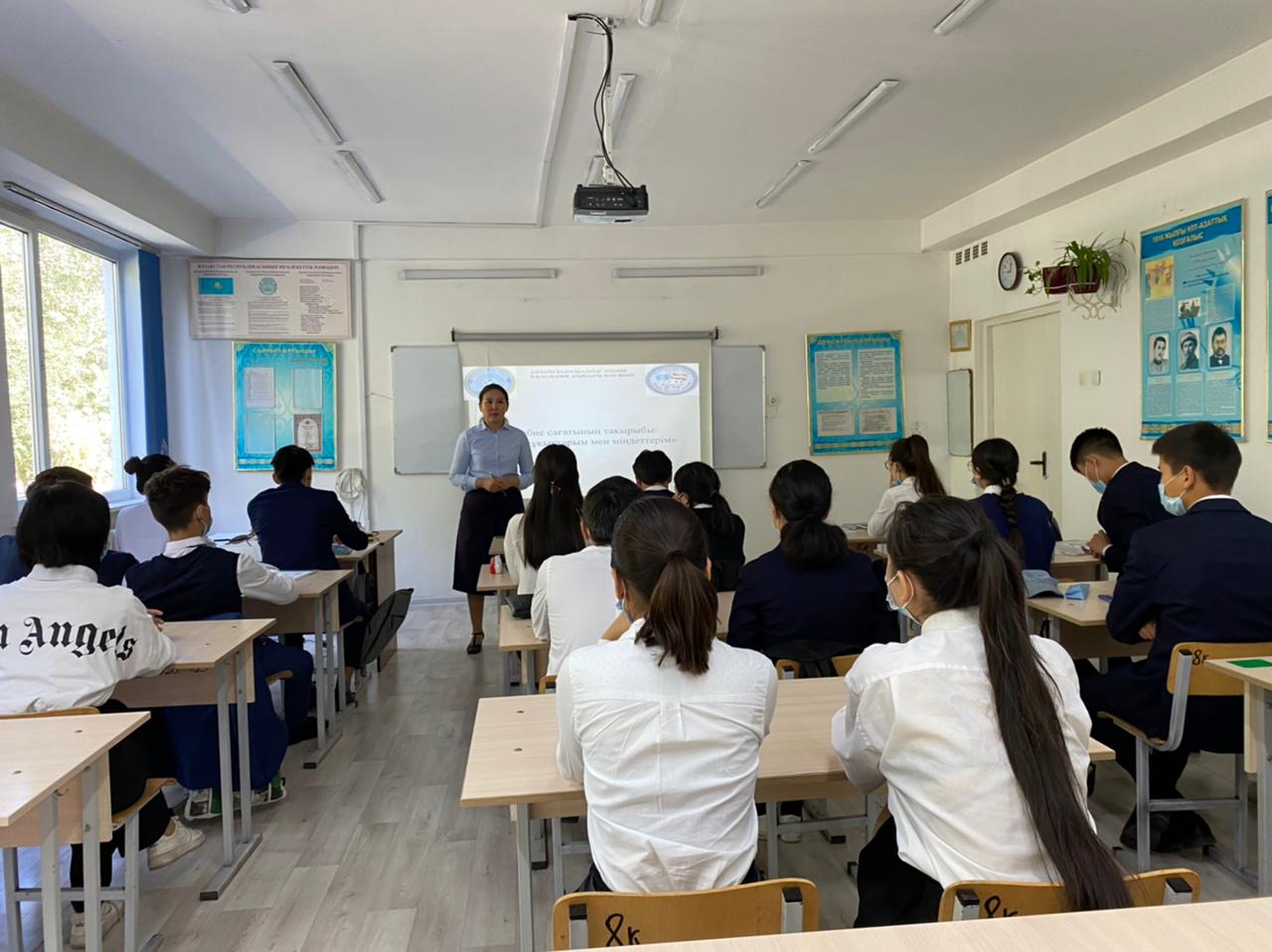 Мектепішілік "Отбасылық тәрбие" бағыты бойынша 08.09.2021ж. күні тарих пәнінің мұғалімдері А.А.Серікбаева, А.Е.Сабыржан және Г.Ч.Кулкубаева 9-11 сынып оқушыларымен "Менің құқықтарым мен міндеттерім", "Заң және заман"тақырыптарында дәріс сабағын өткізді. Мақсаты: оқушыларға өз құқықтары мен заң туралы ойларын дамыту.