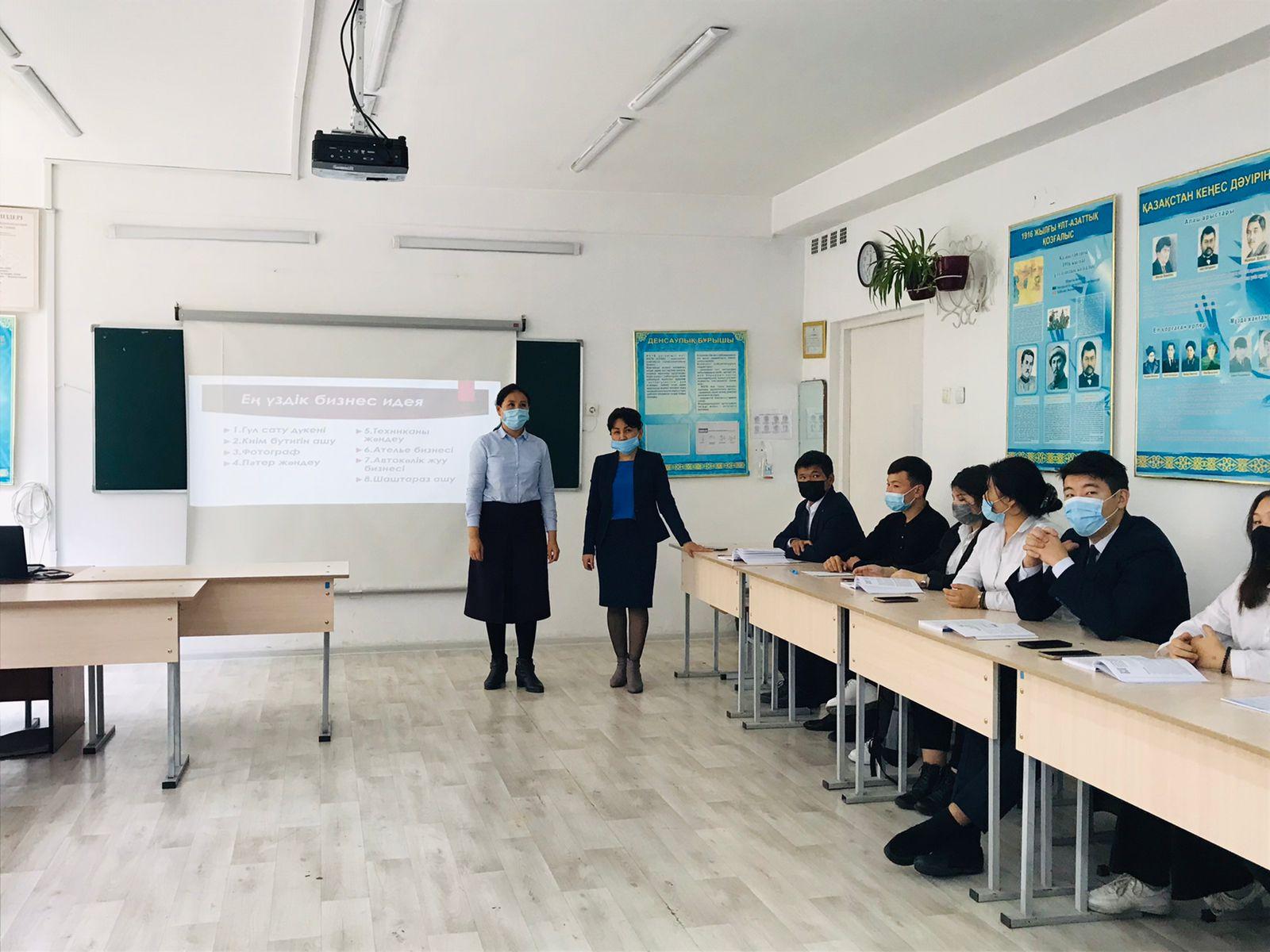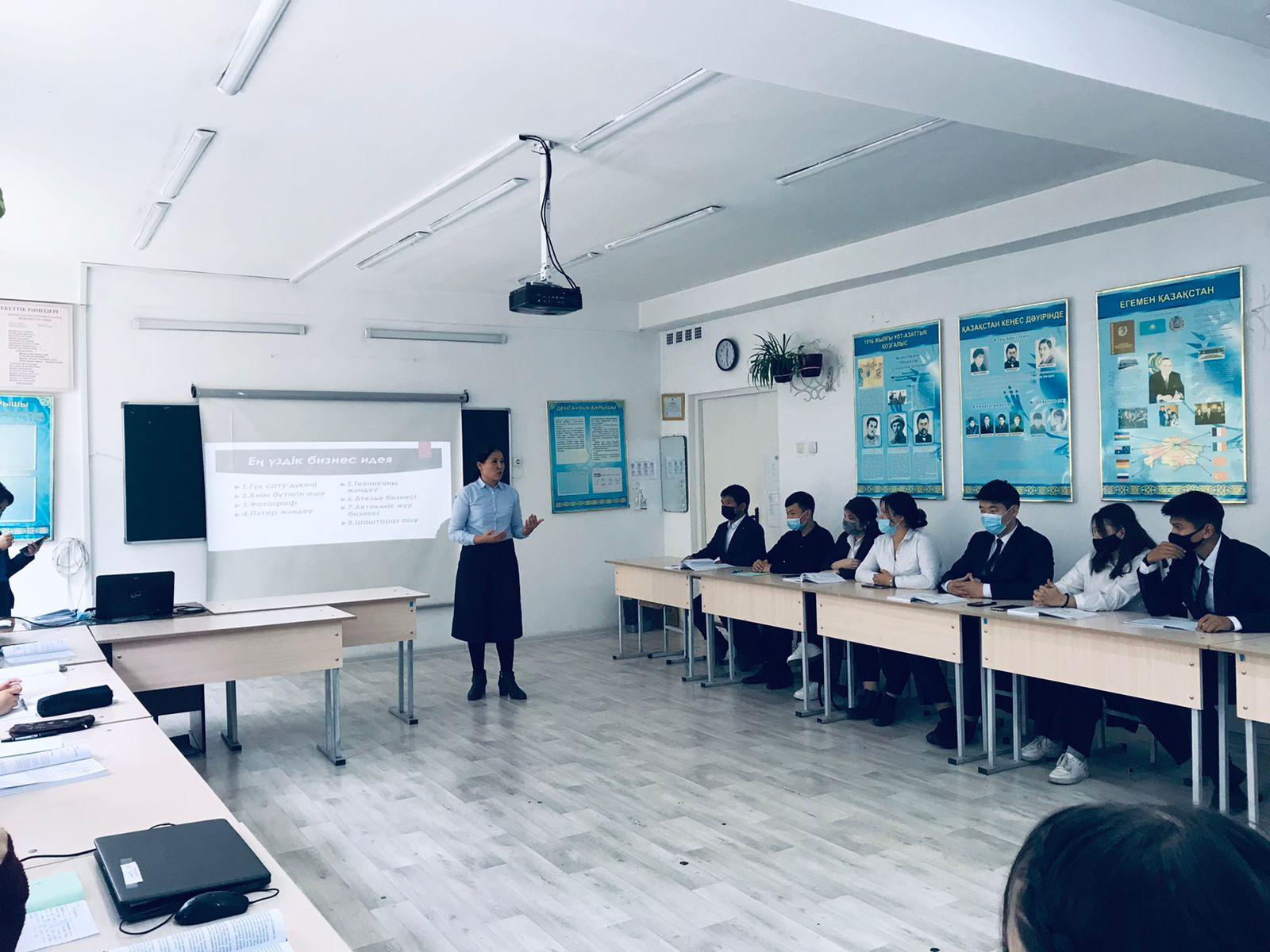 Еңбек, экономикалық және экологиялық тәрбие бағыты бойынша "Bala business" жобасы аясында тарих пәнінің мұғалімдері А.А.Серікбаева және Г.Ч.Кулкубаеваның ұйымдастырумен 20.10.2021ж. күні 10-11 сынып оқушыларының қатысуымен "Менің бизнес идеяларым" тақырыбында бизнес-идея байқауын өткізді.