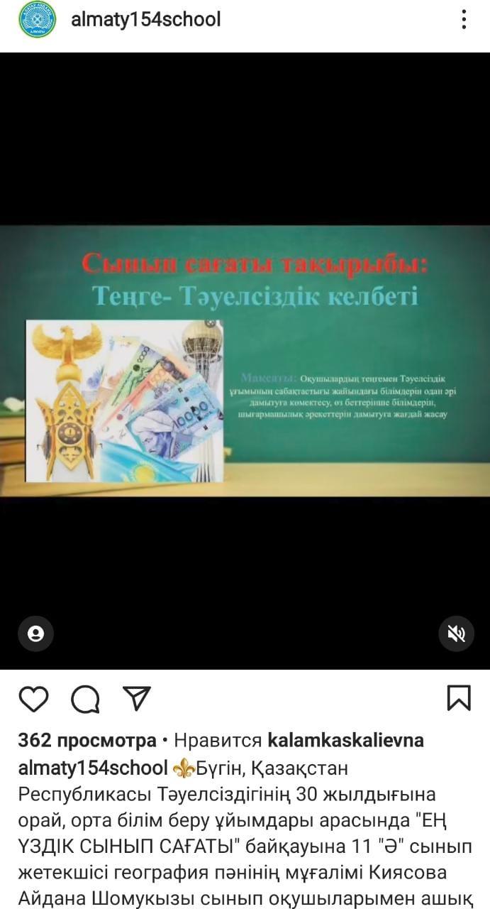 ⚜Бүгін, Қазақстан Республикасы Тәуелсіздігінің 30 жылдығына орай, орта білім беру ұйымдары арасында "ЕҢ ҮЗДІК СЫНЫП САҒАТЫ" байқауына 11 "Ә" сынып жетекшісі география пәнінің мұғалімі Киясова Айдана Шомукызы сынып оқушыларымен ашық сынып сағатын өткізді.