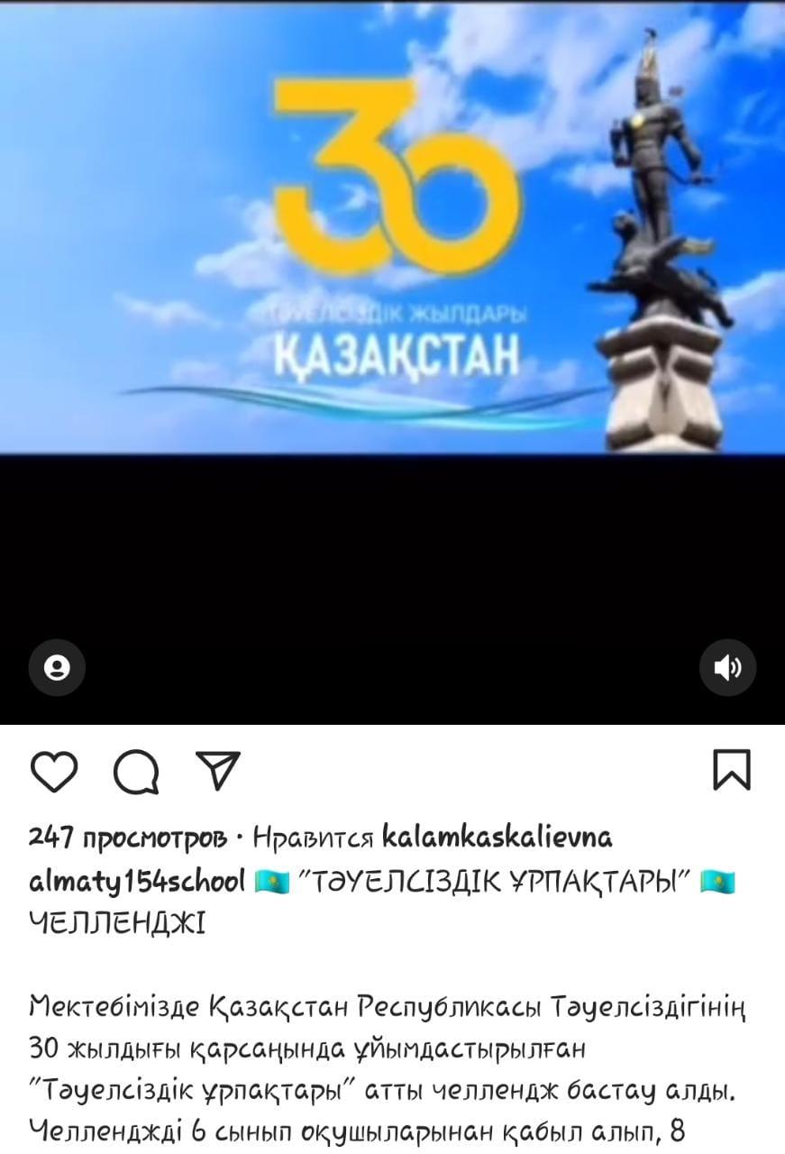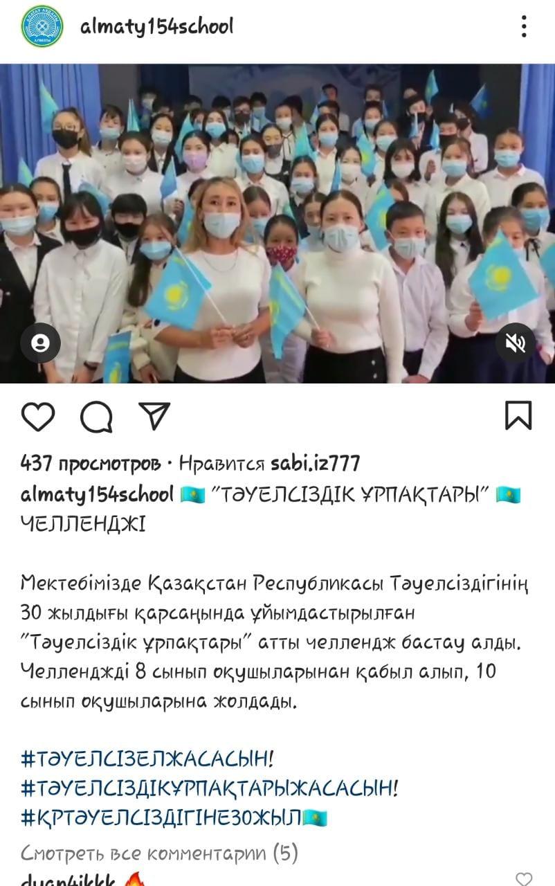 Мектебімізде Қазақстан Республикасы Тәуелсіздігінің 30 жылдығы қарсаңында ұйымдастырылған "Тәуелсіздік ұрпақтары" атты челлендж бастау алды.