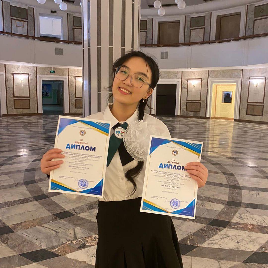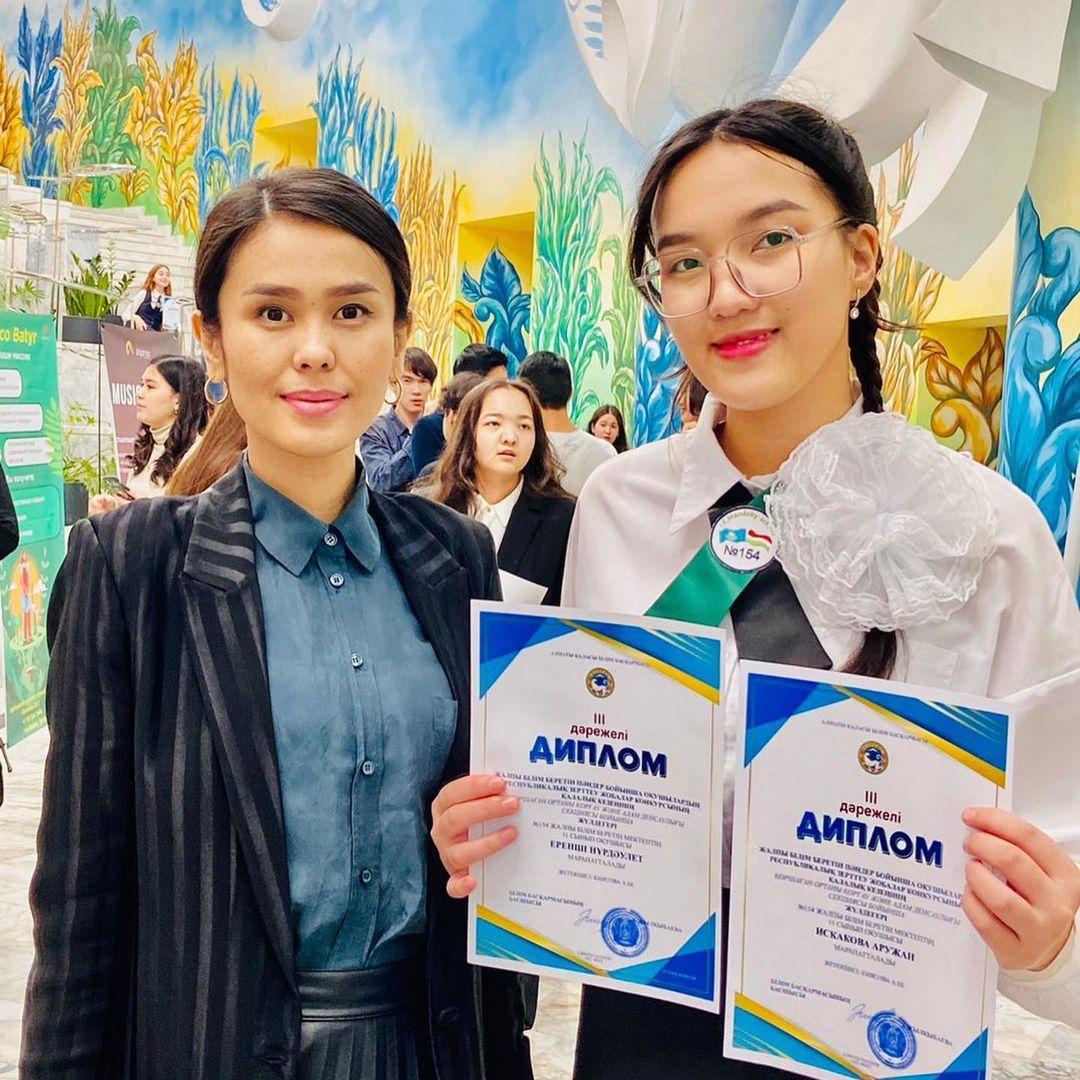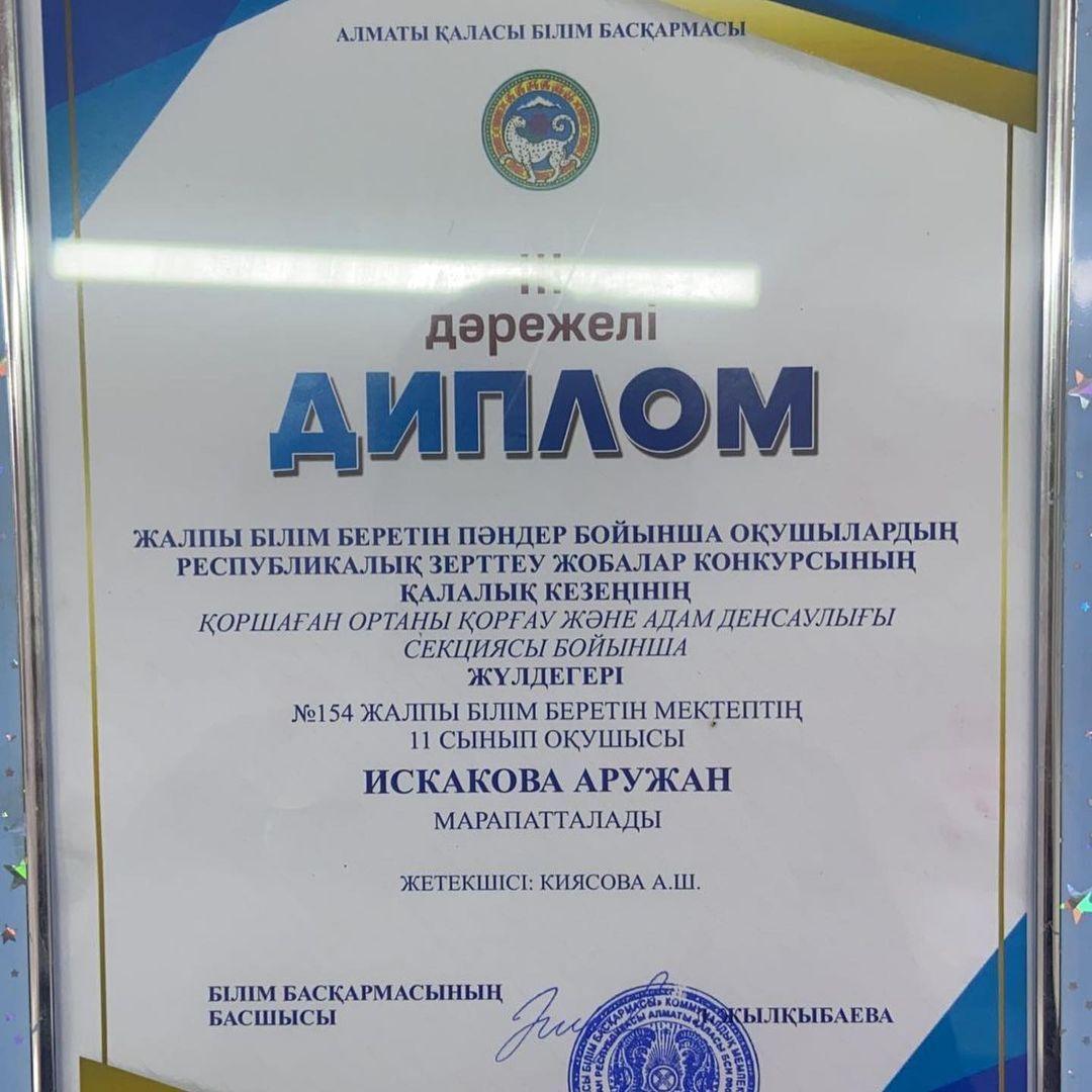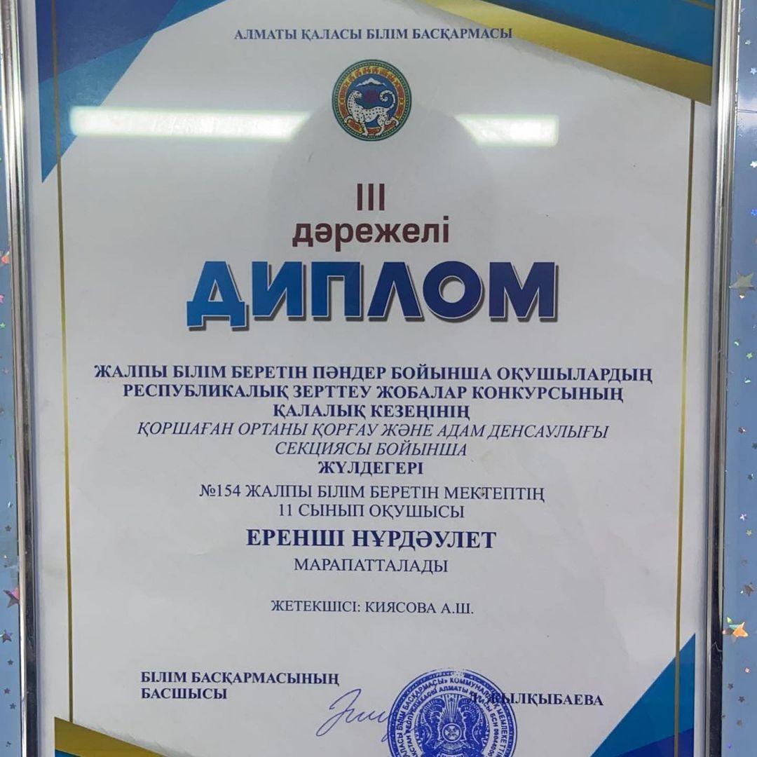 Алматы қаласы Білім басқармасы жалпы білім беретін пәндер бойынша оқушылардың Республикалық зерттеу жобалар конкурсының қалалық кезеңінің қоршаған ортаны қорғау және адам денсаулығы секциясы бойынша жүлдегерлері №154 жалпы білім беретін мектептің 11 "Б" сынып оқушылары Еренші Нұрдаулет және Искакова Аружан