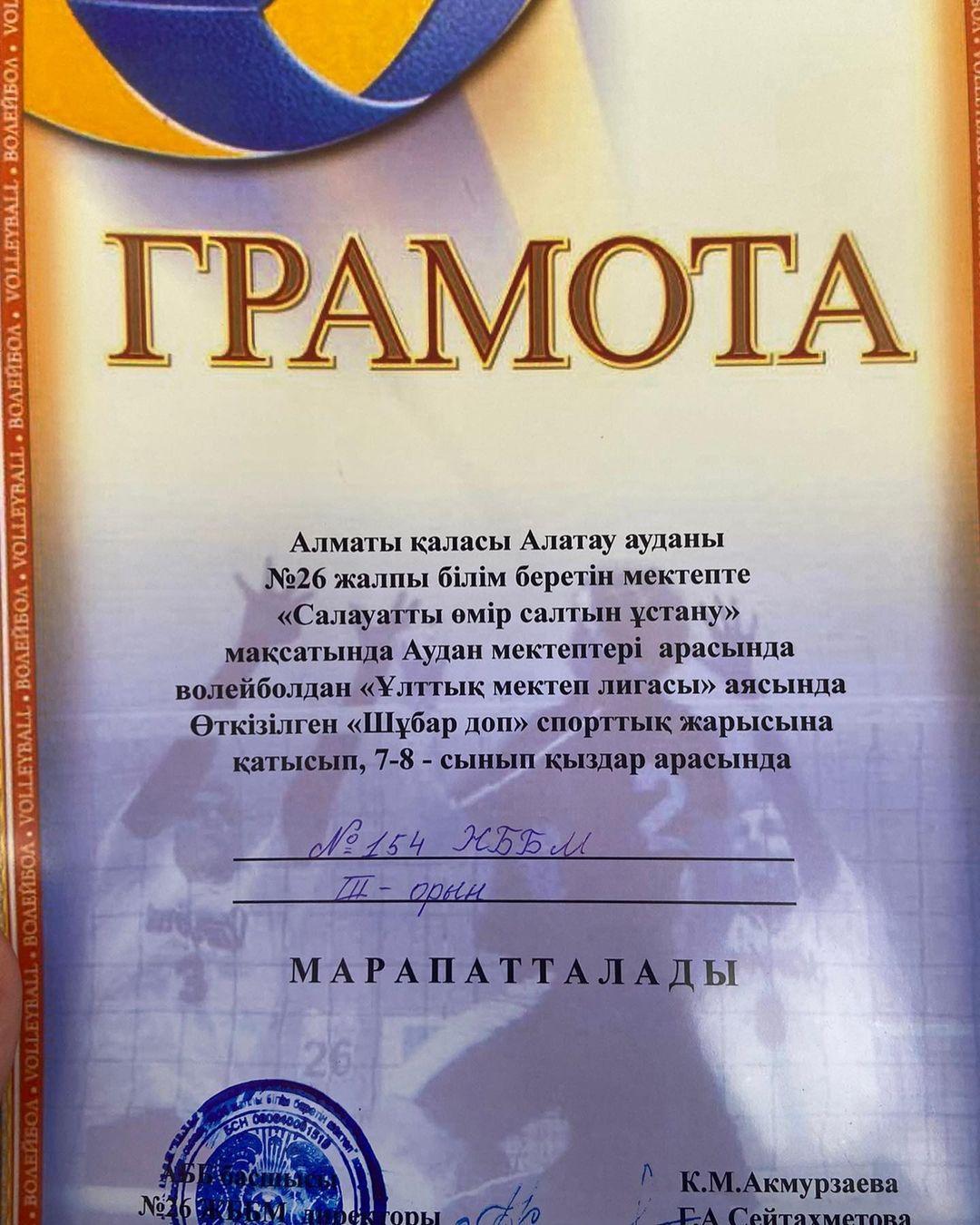 🏀“Салауатты өмір салтын ұстану” мақсатында аудан мектептері арасында волейболдан “Ұлттық мектеп лигасы” өткізілген “Шұбар доп” спорттық жарысына мектебіміздің 7-8 сыныптарынан құрылған қыздар командасы қатысып, жүлделі 🥉ОРЫН иеленді.